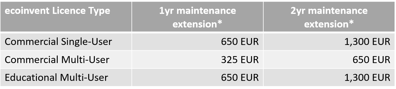 A user's maintenance expired on 1st December 2015. He would like to extend his maintenance by 1 year (to the 1st December 2016) to gain access to ecoinvent 3.3. If he renews his maintenance before the 1st December 2016, he can extend his maintenance for EUR 500.