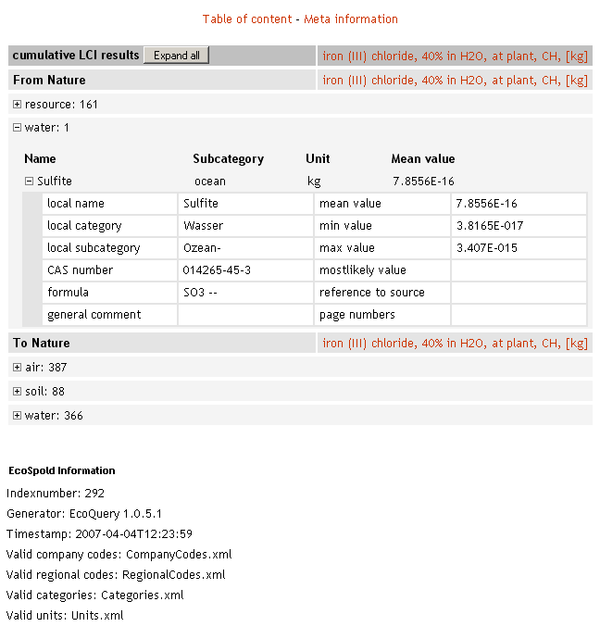 The display of elementary flows can be collapsed by clicking on the - sign. "Expand all" and "Collapse all" applies the respective action to all categories with one mouse click.