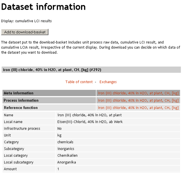 To view details of a dataset, click on the view option of the dataset in the search result (UPR, LCI, or LCIA), or, if you have already selected the dataset for download, click on the view-link in the list of datasets contained in the download-basket.