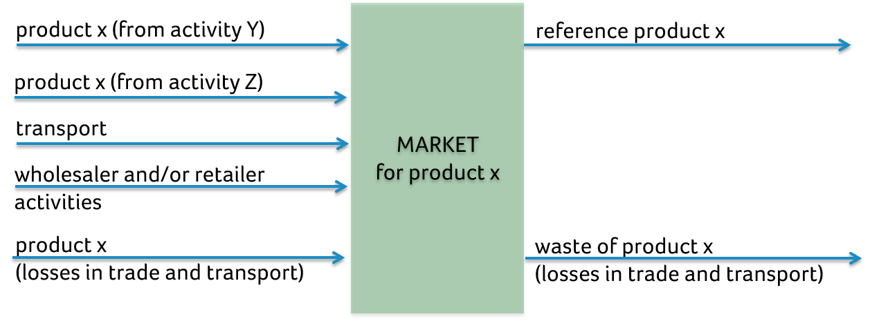 For example, the production volume of glycerine produced in "glycerine production, from epichlorohydrin/GLO" dataset is 4.8E+8 kg/year. In the figure below, this means that the production volumes of product X in the activities Y and Z determine the shares of producing activity Y and producing activity Z on the market for product x.