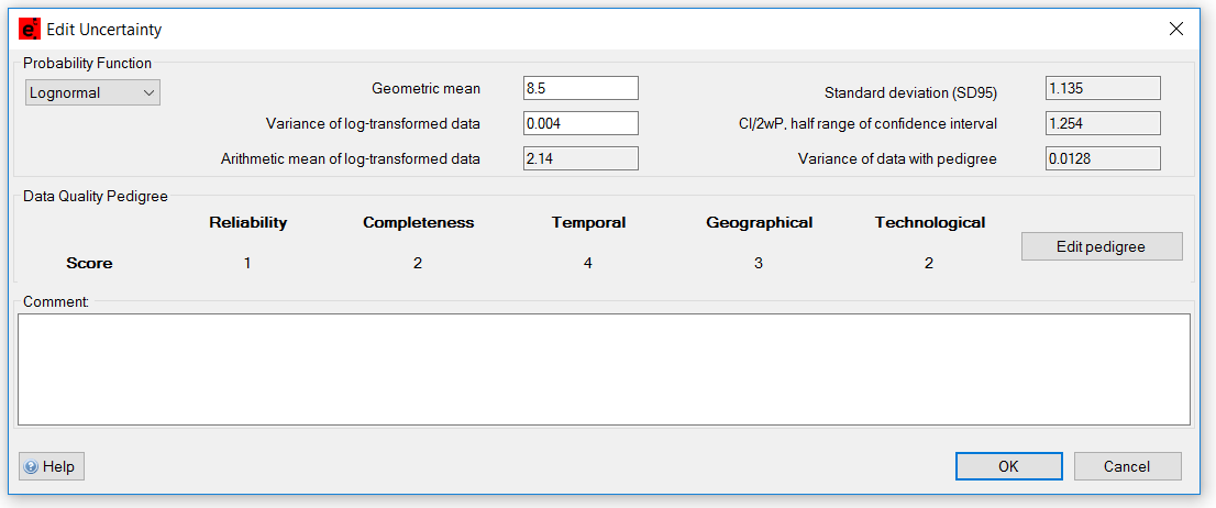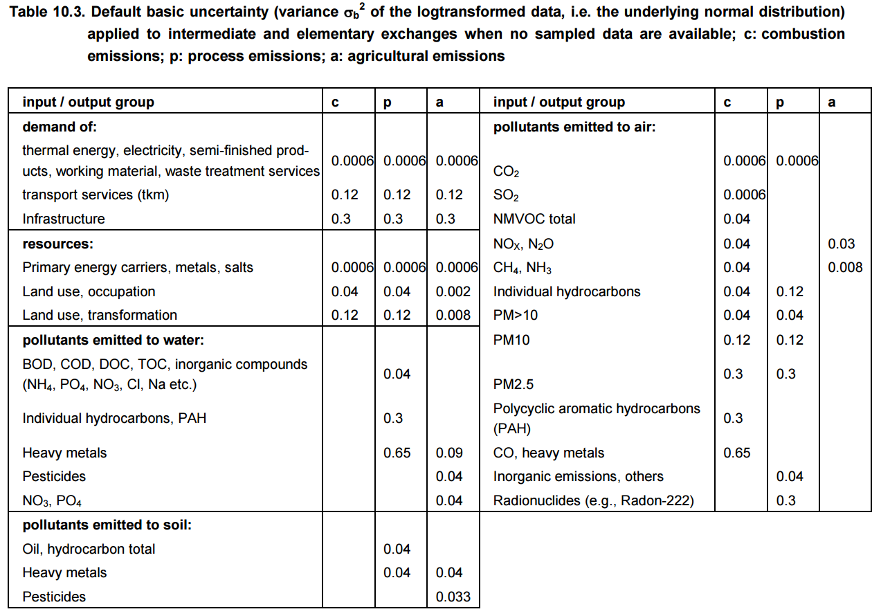 Then, the basic uncertainty is chosen. This value reflects the fact that even a "perfect" data is uncertain: there are fluctuation over time, errors in measurements, etc. The table 10.3 of data quality guideline provides for values, depending on the type of exchange and process modelled. In ecoEditor and ecoQuery, this value is called "Variance of log-transformed data". The field "Standard deviation (SD95)" is equal to exp((Variance of log-transformed data)^0.5)^2, a value that is not used anywhere in the rest of the calculation.