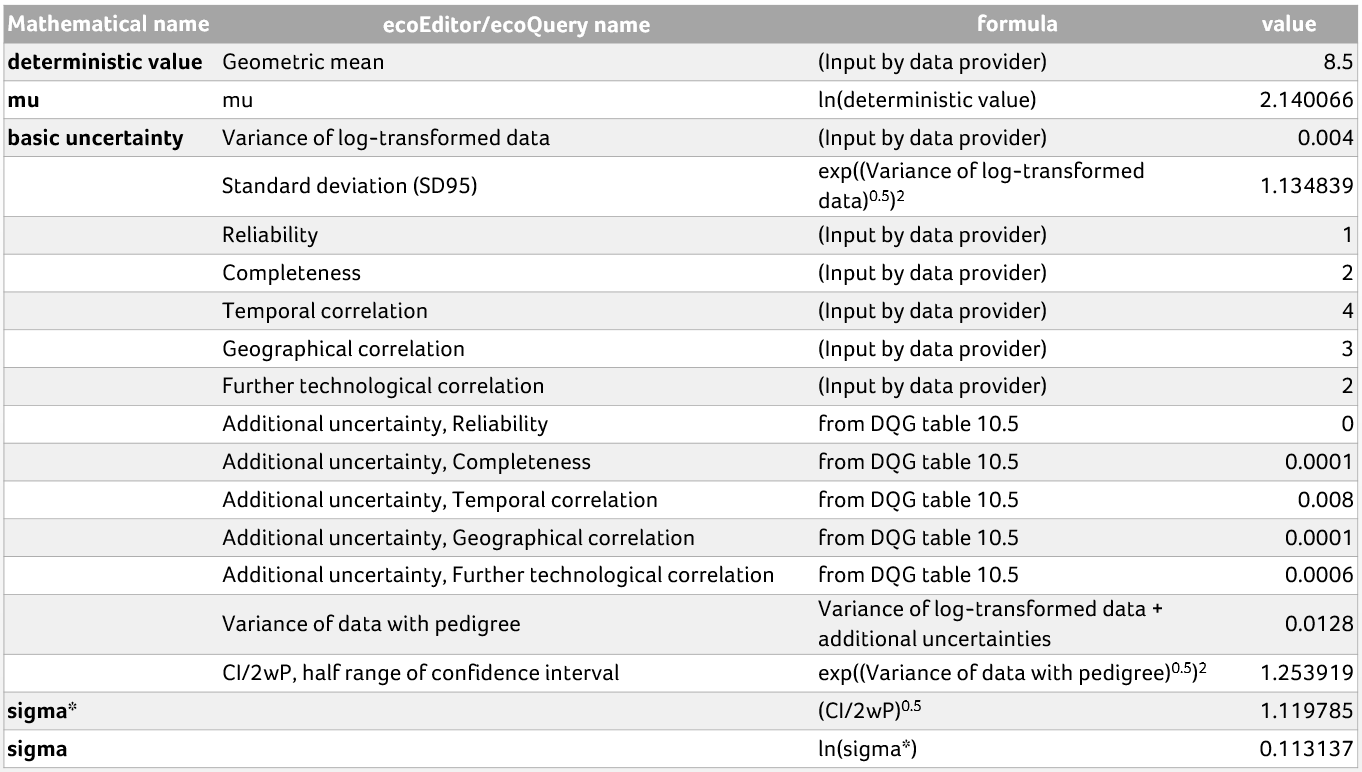 Three inputs are necessary from the data provider to determine the parameters of the lognormal distribution: the deterministic value, the basic uncertainty and the pedigree matrix.