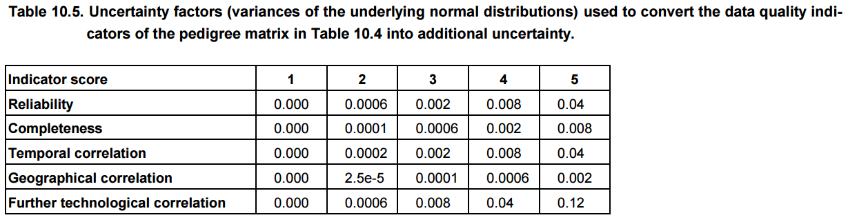 Then, a score from 1 to 5 is selected for 5 indicators: reliability, completeness, temporal correlation, geographical correlation, further technological correlation. These scores are transformed into additional uncertainty in order to reflect that the amount of an exchange might come from sources that are not as reliable as primary data collection. The values can be older, from a different technology, another part of the world or based on estimates rather than calculation or measurement. Table 10.5 of the data quality guidelines shows the relationship between the pedigree scores and the additional uncertainty.