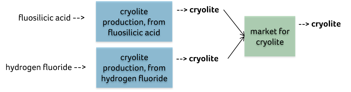 Fluosilicic acid is used as an input from technosphere for example in cryolite production, from fluosilicic acid. Cryolite can be also produced from hydrogen fluoride. Both productions supply the same market for cryolite.